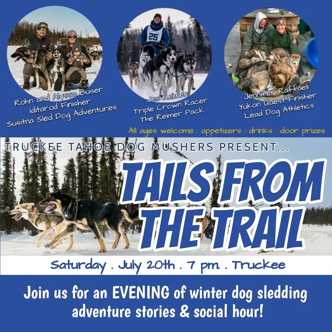 Join us for an evening of dog sledding adventure stories & social hour! Listen to stores from Iditarod family Rohn, Alyssa and Kaladin Buser. Rocky Mountain Triple Crown musher and Truckee local Jesika Reimer. Yukon Quest finisher, and Truckee local Jen Raffaeli.